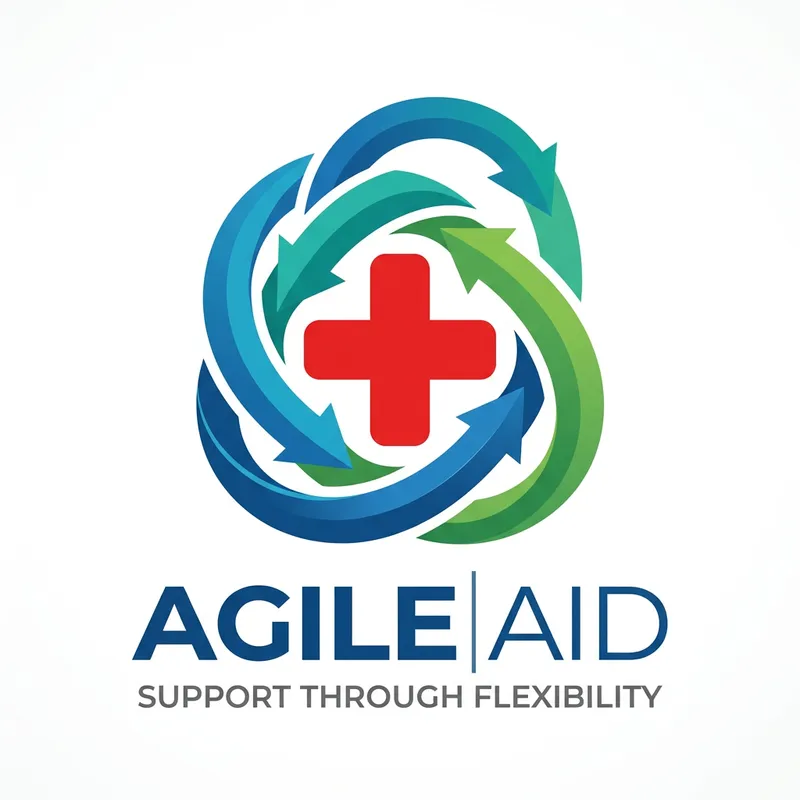 Create a unique logo that symbolizes the marriage of two ideas: agile methodology and the symbol of a red cross. The main component of this logo should represent agile methodology, a set of values and principles that espouse flexibility in work processes, constant feedback, and adaptive planning. This element can be represented in an abstract or literal way; perhaps as a series of intertwining flexible ribbons or something more direct like a stylized scrum board. Intersect or overlay this with the universal symbol of a red cross, representative of aid and support. The cross should be prominently red to maintain its visual power and recognition. The overall design should be harmonious and balanced, ensuring both elements can be discerned.