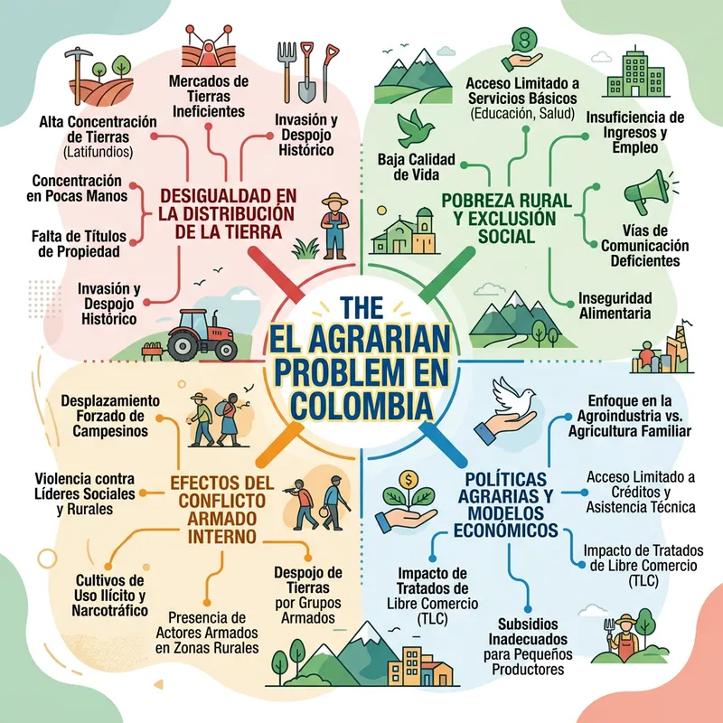 Generate a conceptual map discussing the agrarian problem in Colombia. The map should clearly outline the various issues at hand such as land distribution, rural poverty, agricultural policies, and effects of armed conflict. Each problem area should be represented by a distinct branch or node, linked to subtopics that further elaborate on specifics of the issue. The overall aesthetic should be professional yet accessible, with easily readable text and logical structuring.