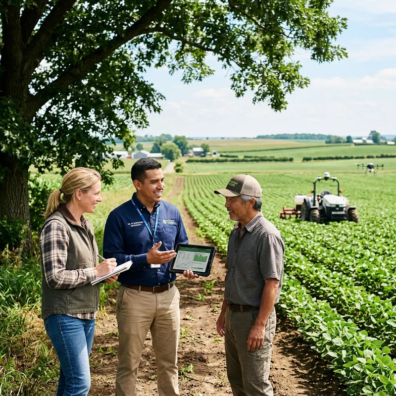 An Hispanic male agronomist in professional attire engaged in a discussion with a Caucasian female farmer and an Asian male farmer. They are standing amidst a well-maintained crop field, demonstrating agricultural innovation. Innovative farming machines can be seen in the background. It's a sunny day, and they stand in the shade of a large tree, with a view of the picturesque farmland extending beyond them into the horizon.