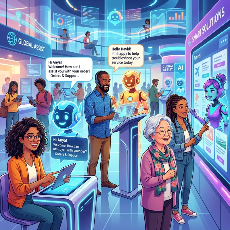 AI agents helping customers, modern digital art style, diverse customers interacting with friendly AI avatars.
