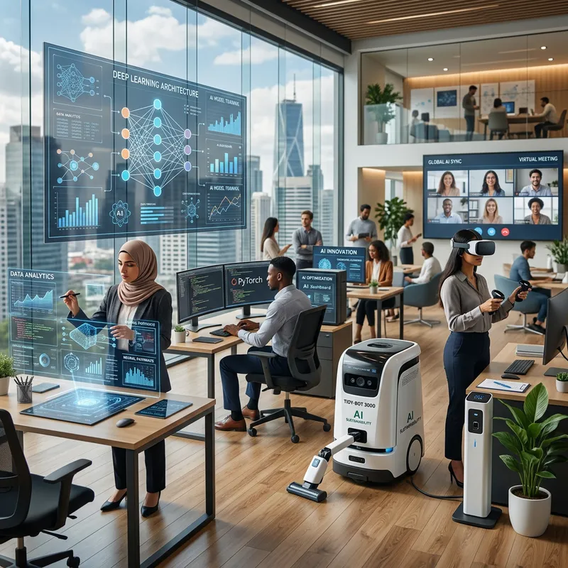 Illustrate a modern business scene featuring various aspects of Artificial Intelligence. Show a sleek office with a large glass wall, a high-tech transparent screen displaying a neural network diagram, and a team of diverse professionals. The professionals include a Middle-Eastern woman analyzing data on a holographic interface, a Black man programming on a futuristic computer, and a South Asian woman using a virtual reality headset for a video conference. A white autonomous robot is seen tidying up the workspace, promoting sustainable practices. Emphasize the dynamic, innovative atmosphere and the integral role of AI in this context.