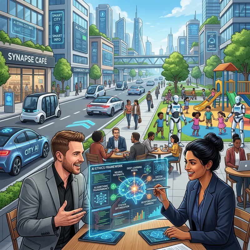 Imagine a future society where AI has had a significant impact. We see a street full of clean, well-managed buildings. Digital interfaces are embedded in every wall, serving as personal assistants for everyone. Autonomous electric vehicles fill the streets, efficiently following the prescribed traffic norms. In a park, robotic caregivers assist children of diverse descents and genders, facilitating their play and ensuring their safety. Meanwhile, at a café, a South Asian woman and a Caucasian man engage in an animated discussion. They're brainstorming over a digital interface projecting holograms of complex diagrams and codes depicting AI technology advancements.