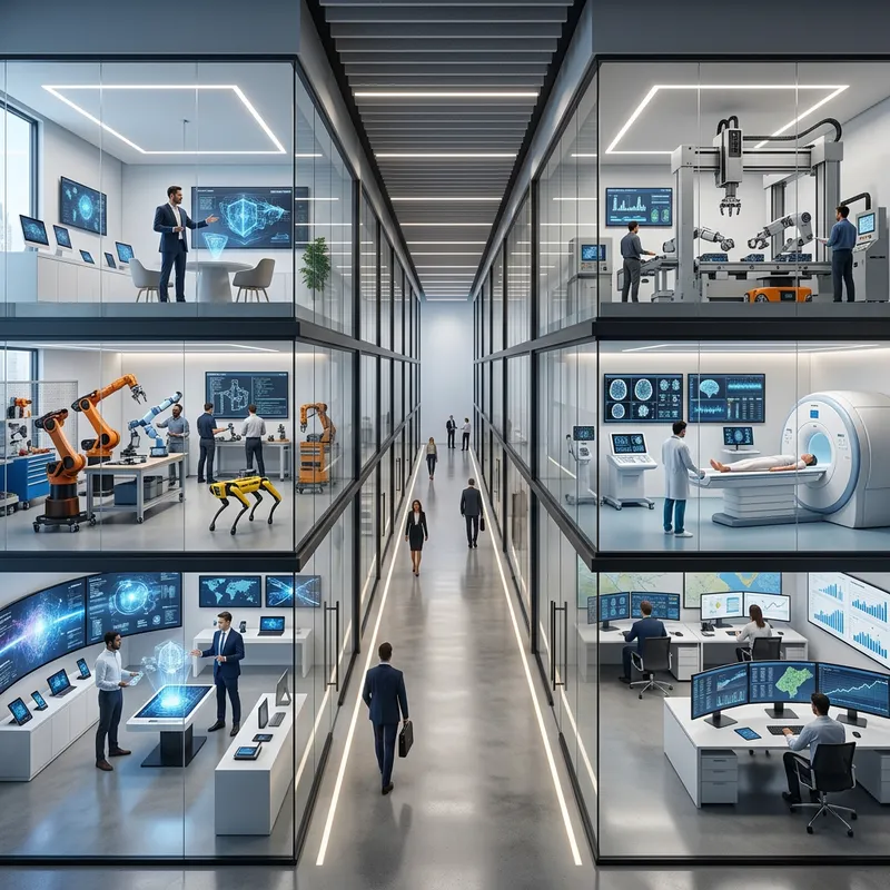Generate an image showcasing the sophisticated interiors of an Artificial Intelligence Innovation Center. The facility embodies modern design and high technology, devoid of any display text. The center is divided into several state-of-the-art rooms, each associated with a cutting-edge sector: a robotics lab stocked with various pioneering robots; a sales department showcasing the latest, forefront technologies; a healthcare chamber equipped with advanced AI-powered medical devices; an insurance hub highlighting AI-enabled risk assessment tools; and a manufacturing room dominated by AI-driven automation machinery.