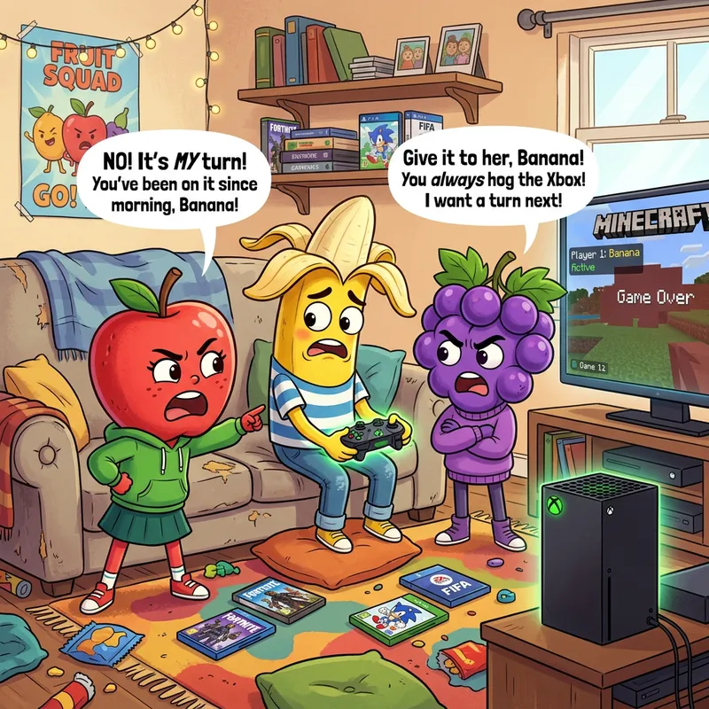 Original Prompt: ai kidsfurits havin argument over who plays xbox in a house