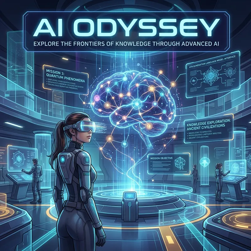 Concept art for an innovative game called 'AI Odyssey'. It explores the fusion of advanced artificial intelligence, specifically a concept of a 4th generation language model like GPT-4, with edutainment games. The game could focus on interactive learning and knowledge exploration through a series of high-tech missions. The setting should be modern and futuristic with elements directly linked to AI design, possibly including digital rooms, high-tech devices, and futuristic elements. Please avoid using copyrighted characters or real people in the image.