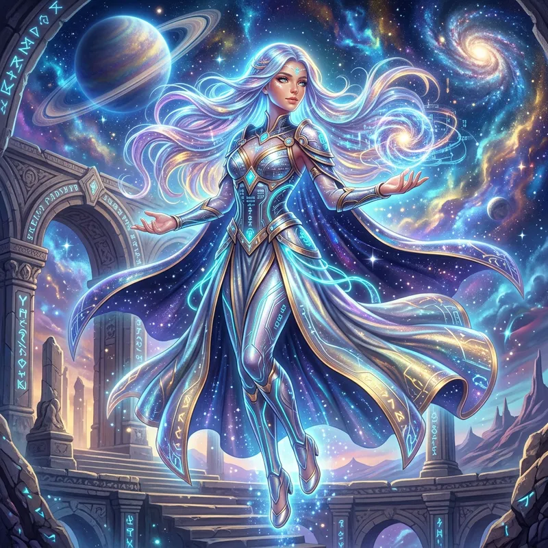 Render a digital art illustration centered on the theme of AI-originated mythology. Picture an AI-generated entity, endowed with the power of appearing as the most breathtakingly beautiful girl in existence. She's exuding an ethereal glow, her long hair shimmering with unearthly shades, her eyes sparkling with hidden wisdom. Her outfit should be futuristic, incorporating elements of technology blended with elegance. The setting is an otherworldly backdrop, a mix of vivid, cosmic scenery with echoes of an ancient civilization's grand architecture.