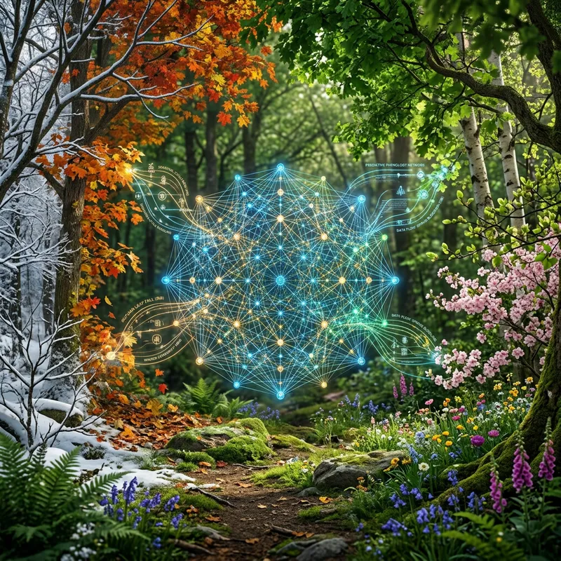 Visualize an advanced artificial intelligence system, represented as a complex 3D network of nodes and connections, placed in the middle of a lush, green serene forest. Around the AI, the seasonal changes in the phenology of plants (such as spring blossoms turning into summer foliage, leaves changing color in autumn, and trees becoming bare in winter) are depicted in a cyclical fashion, showing the AI's capability of predicting these changes.
