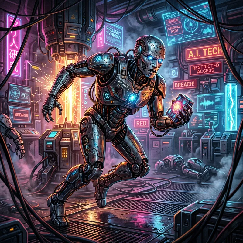 An AI-powered robot in a futuristic laboratory filled with cutting-edge technologies. The scene is lit with high-contrast lighting, enhancing the dramatic atmosphere that is typical in cyberpunk-themed science fiction movies. It captures the robot in a dynamic pose, denoting a sense of urgency, while its face displays intense expressions, highlighting its sentience. The artwork is created digitally and boasts vibrant colors coupled with sharp details that further highlight the hyper-realism of the robot and its surroundings. The overall style of the picture harkens back to the gritty, neon-infused aesthetic of when cyberpunk first emerged.