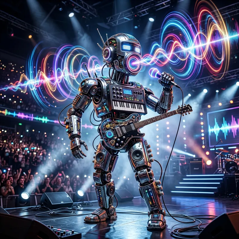 An artificial intelligence robot expressing itself through the medium of song. It has an elaborate design similar to a state-of-the-art music studio, with gleaming metal and twinkling lights comparable to a concert stage. Its 'mouth' is not a typical mouth as humans have, but a sound output device giving a visual representation of its melodious tunes. As it sings, colorful visualizations of the soundwaves pulse from it, creating a vibrant spectacle. Its 'eyes' are glowing LED indicators, and its structure is a blend of modern electrical components and an echo of human form, incorporating musical instruments as if built into it.