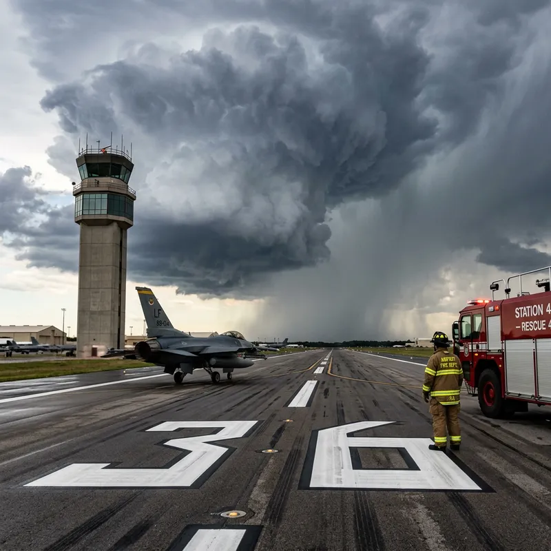 Air Traffic tower, a cumulonimbus cloud on the top, a firefighter, and F-16 and a runway with the number 36.