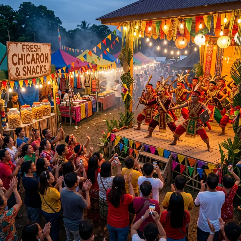 A lively scene at a traditional festival, with spirited Ajian dancers mid-performance. On a brightly decorated stage, a group of dancers, dressed in vibrant traditional costumes, are engaged in a synchronized dance routine. The audience, visibly enthralled by the performance, are cheering and clapping along. Nearby stalls are adorned with festival decorations, selling a variety of goods, including the festive delicacy, Chicaron. The atmosphere is electric and bursting with energy and vibrancy.
