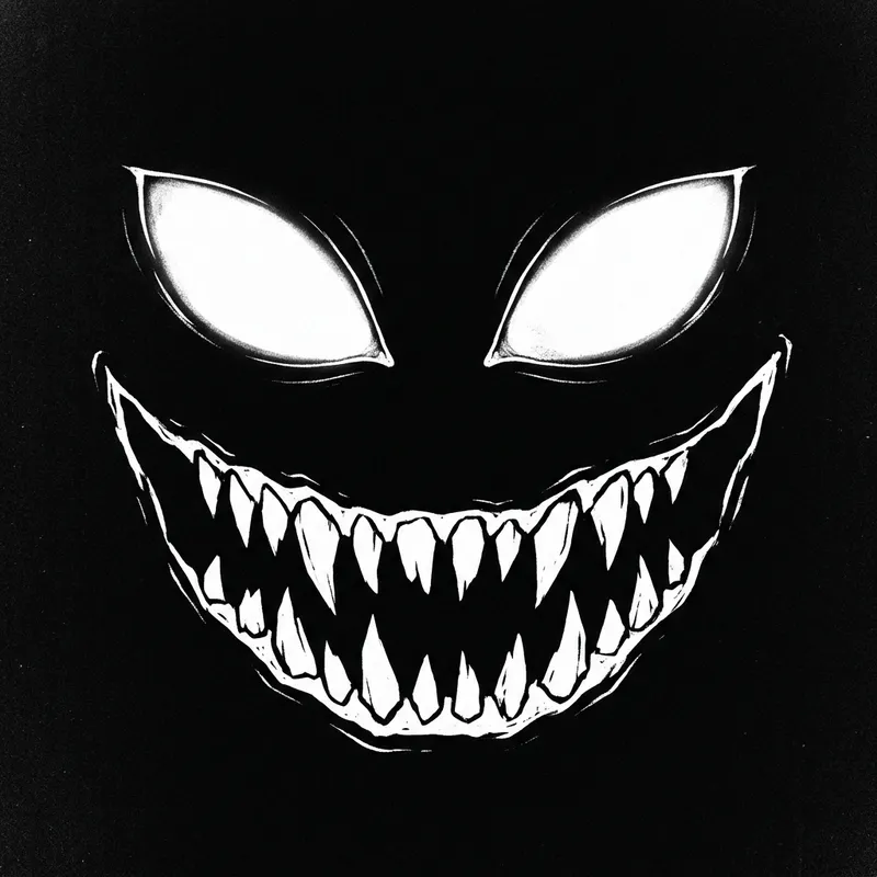 A pair of wide, glaring eyes and a jagged mouth appear in stark white against a pitch-black background. The eyes are alien-like, elongated and almond-shaped, giving them a menacing look. The mouth, in contrast, is unusually wide, stretching across the black canvas, filled with sharp, irregular teeth that resemble daggers. Despite the appearance, this image does not relate to or represent any particular copyrighted character.