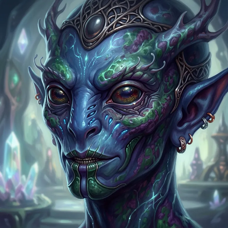 An elaborate illustration of an extraterrestrial being's visage. The creature from another world possesses facial structures and features that differ significantly from humans; its eyes, mouth, and other features are distinctly alien yet fascinating. The skin tones reflect colors not often seen in Earth's life forms. It exhibits an enigmatic expression that hints at the profound intelligence, wisdom, and possibly emotions that these interstellar beings might possess.