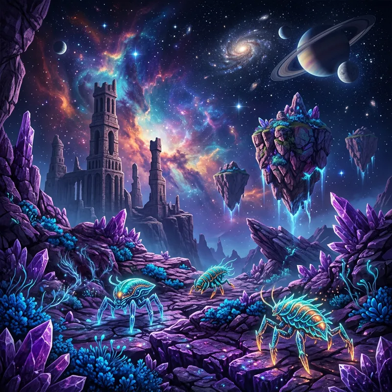 Alien landscape with a space ambiance. Imagine an unknown planet with extreme ecological conditions. The ground could consist of purple crystalline formations interspersed with wisps of blue alien vegetation. The sky is lit by a giant gas nebula, casting an aura of multicolored light across the lands. Perhaps there are towering archaic structures in the distance, remnants of a long-gone civilization. Floating islands hover in the mid-air, held aloft by mysterious forces. Would be great to see exotic creatures, possibly silicon-based lifeforms, their bodies glowing with bioluminescence, meandering through the scene. A view of stars, nearby planets, and a galaxy are in the clear night sky.