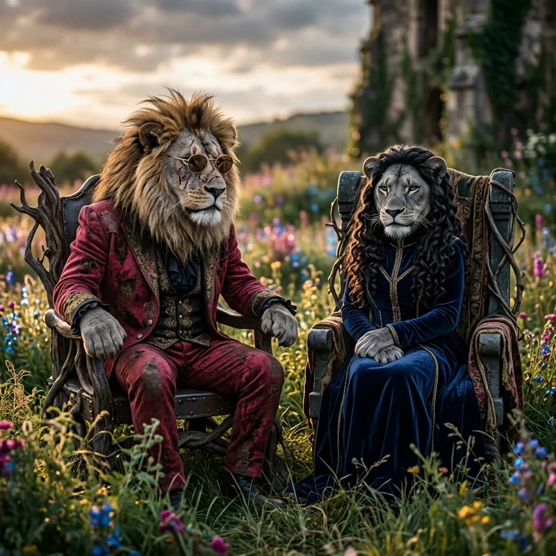 Alpha Lion and Majestic Lioness in Human-Like Attire