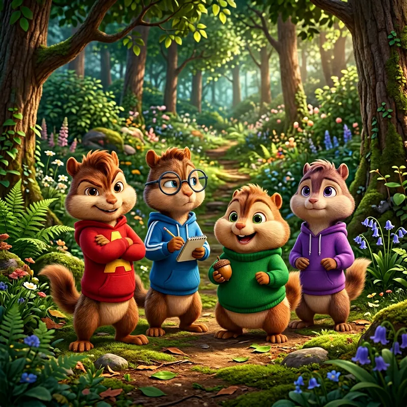 Four animated chipmunks are standing together. One of them, in a red shirt, seems to have a confident and clever demeanor, distinct from his brothers. Another, in a blue shirt, appears lost in his thoughts as he looks off into the distance. The third one, wearing a green shirt, wears a joyful and playful expression while the last one, in the purple shirt, seems to be the quietest, almost as if he's absorbing the surroundings. They all are anthropomorphic, looking more like small boys than actual chipmunks, and are set against a background of a vibrant and harmonious forest.