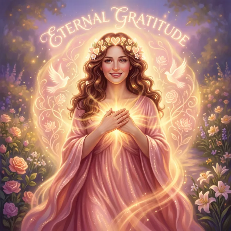 A symbolic representation that depicts an amazing and beautiful woman standing with warmth and love radiating from her. She has an aura of eternal love surrounding her, expressing an eternal gratitude.