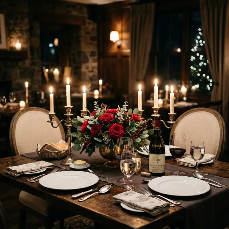A romantic dinner scene set in an ambient setting, enhanced by the soft candle light. The dining table is elegantly laid with pristine white plates, crystal glasses, silverware, and a floral centerpiece, all illuminated by the warm glow of multiple candles in elegant stands. A bottle of vintage wine sits uncorked, waiting to be poured into the accompanying wine glasses. The room is dimly lit, creating a serene and tranquil ambiance that suggests an evening of intimate conversation and gourmet food. Despite the empty chairs, the scene radiates warmth and enticement.