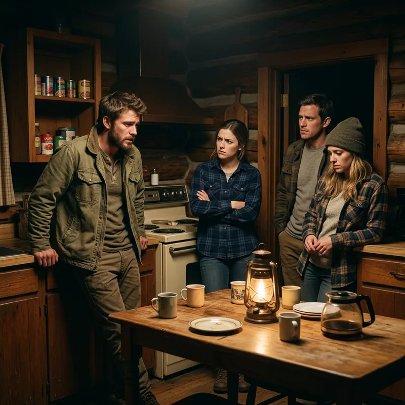 Ambience: Kitchen of a rustic cabin. Dim, warm light with shadows reflecting tension. There are cups, plates, and an old lamp lit on the table. Characters: A: speaks with a mix of confusion and suspicion. Z: shares something unsettling with a serious, almost pained look. E and D: listen silently, with expressions of doubt and growing discomfort. Visual Action: The four former teammates stand or lean on kitchen surfaces while talking. Z says something that leaves the others stunned. The atmosphere feels more emotionally charged despite being brighter than the living room.