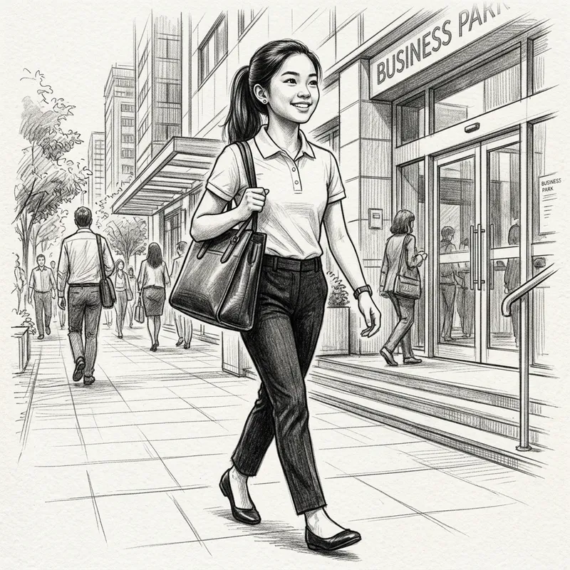 An adolescent girl of Asian descent is heading to the office, dressing professionally. She is wearing a crisp white polo shirt and black pants, providing a classic contrast. Her face is radiant with determination and ambition, hinting at her eagerness to excel in her career. This scene is depicted in a sketch-like artistic style, invoking the qualities of an artistically rendered pencil sketch, with carefully detailed lines and nuanced shading to add depth and realism.