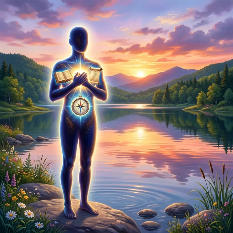 An abstract visualization of 'inner knowing'. It is displayed as a human figure, standing in a peaceful, serene location surrounded by the tranquility of nature. Inside the silhouette of the figure, different symbols that signify 'knowledge', such as an open book, an ancient scroll, a compass, and a bright glowing orb can be seen. The figure is in a state of meditation or deep thought, conveying a sense of understanding and enlightenment. The background should be filled with the serene beauty of nature, with a tranquil lake, lush green trees, and a breathtaking sunset.