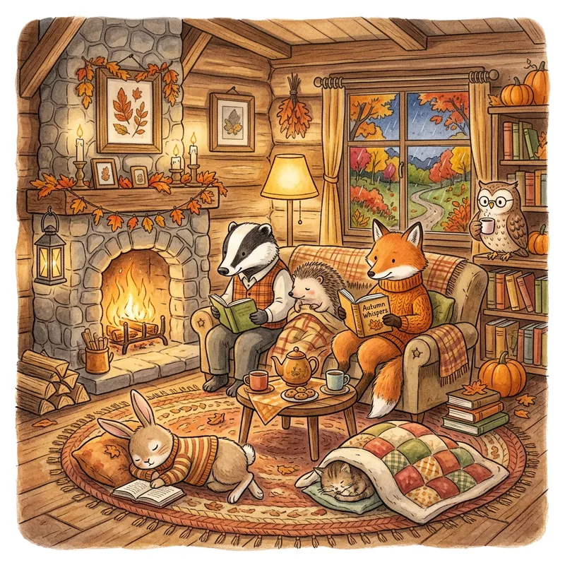 An adorable and cozy illustration of anthropomorphic woodland animals relaxing indoors during autumn.