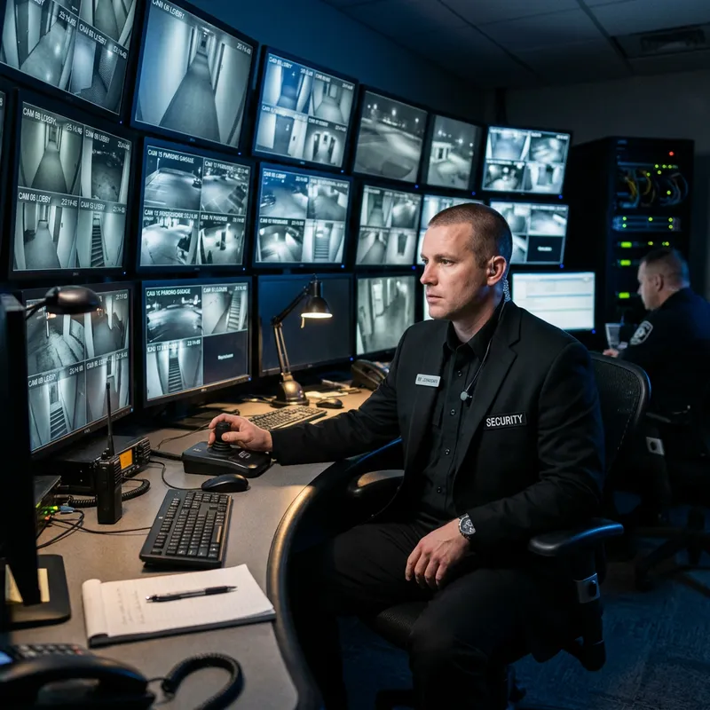 An American male security guard in his 30s, with short, cropped hair, wearing a black blazer and slacks, monitoring security cameras in a dimly lit control room at night.