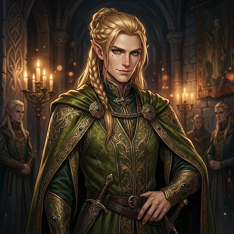 An anime illustration of a stunningly handsome elf noble with golden blonde hair tied back, blue eyes, and a small mole under his right eye. He wears a moss-green and golden noble outfit with intricate embroidery, exuding a sly, confident smile. Dark fantasy Grim Hollow style, cinematic lighting, detailed textures, noble elven aura, atmospheric dim background with candlelight, 8K ultra-realistic portrait.
