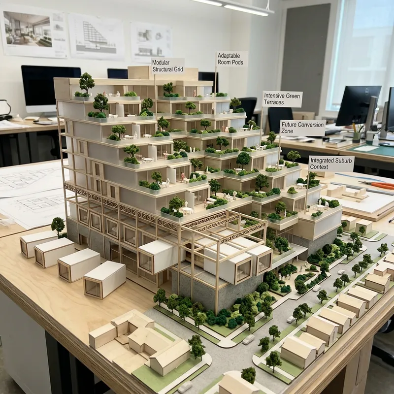 An architectural concept model for a suburb hotel with stepped terraces and utilises construction technology to achieve future convertible spaces