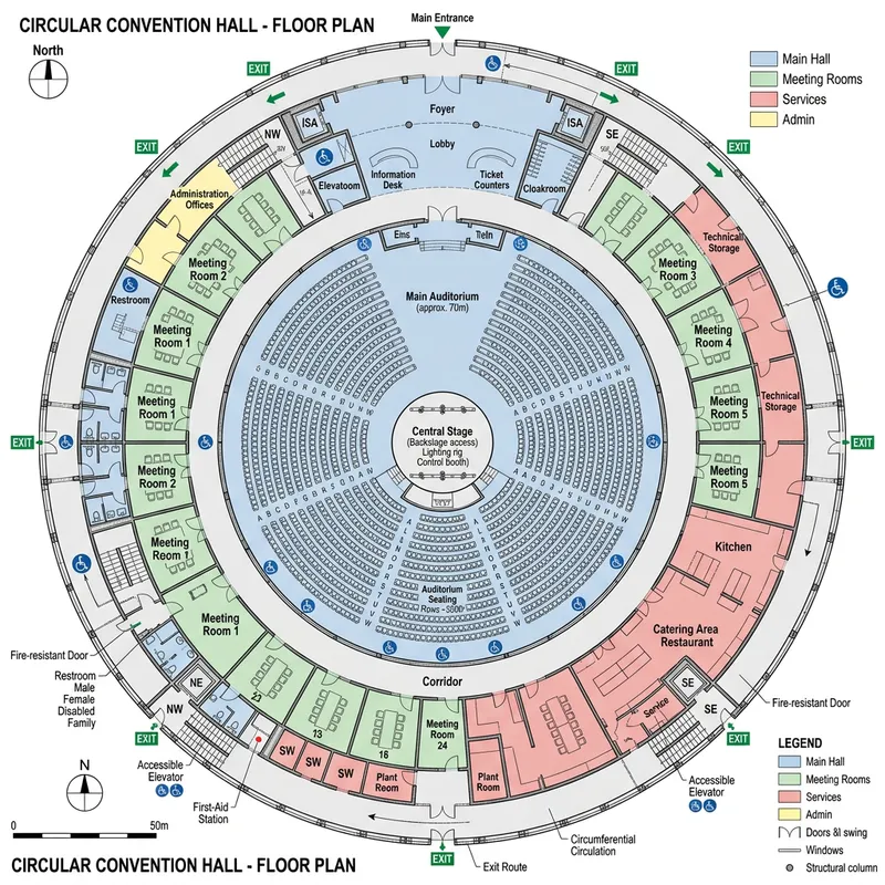 An architecturally accurate floor plan of a conventional hall with a circular layout. The entrance facing north, there's an expansive main hall in the center, encompassed by numerous smaller meeting rooms. The hall is populated by symmetrically arranged seating sections, all facing a central stage. Auxiliary spaces like catering area and restroom facilities are positioned towards the periphery. Ensure to include details like exit routes, staircases, and disability access. Visual indicators for the different areas and facilities would also be beneficial.