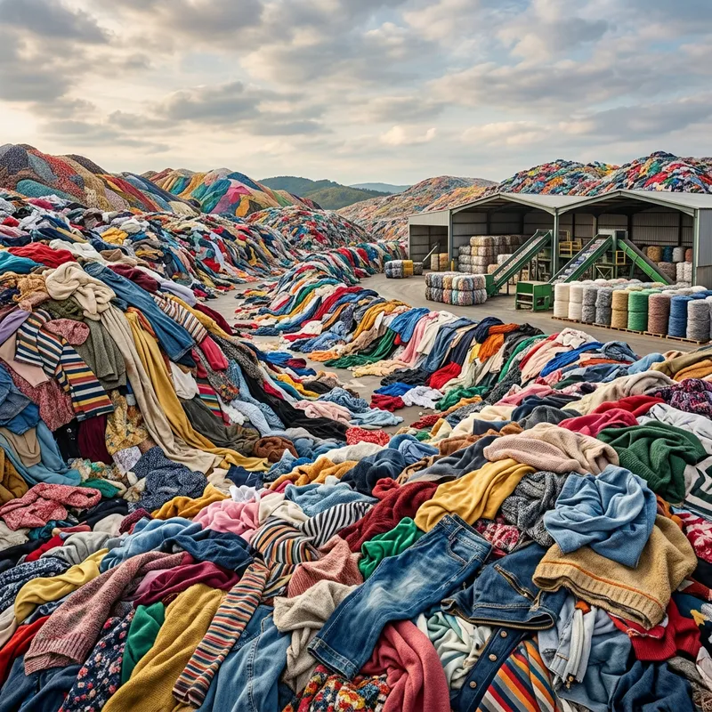 An artistic representation of textile waste without any text. The image should showcase discarded fabrics, clothes, and textiles in a visually striking manner, emphasizing recycling and sustainability themes. The composition should be rich in colors, textures, and patterns associated with various types of textiles, creating an engaging landscape image suitable for a website.