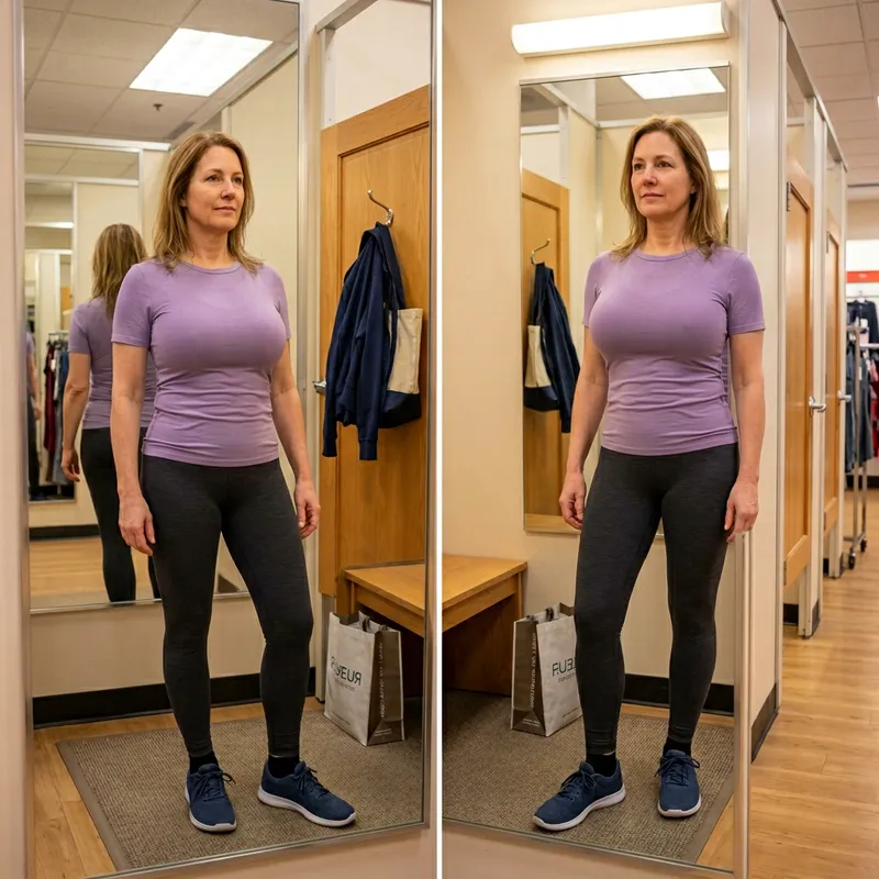 An attractive young looking divorced woman in her 50s with light brown hair and fair skin with a very big bust and attractive figure wearing tight yoga pants and a Tshirt standing in a department store changing room.