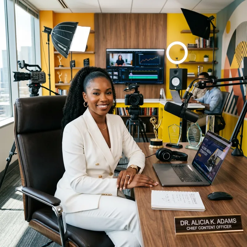 An empowering, beautiful Black woman, with hair in a ponytail ,sitting elegantly at a desk wearing a stylish white suit. She is seated on an executive chair which radiates authority and power. Behind her, the office boasts shades of vibrant yellow, as though to underline her status and the level of respect she commands. The office is filled with studio equipment that signifies modernity and progress, positioning her as a contemporary, forward-thinking woman.