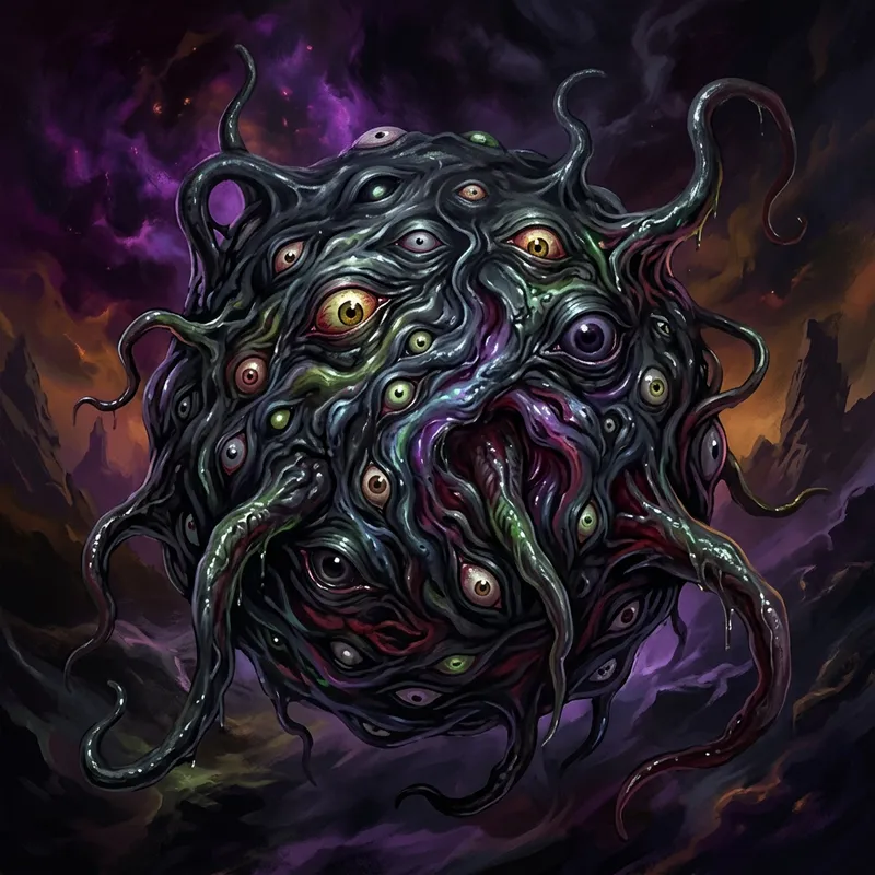 an enormous, grotesque blob of dark matter with protruding tendrils and countless eyes, styled in a vivid, surrealistic modelner, swirling and pulsating, emphasizing menacing features and eerie expressions, digital painting with high contrast and intricate details, horror-inspired