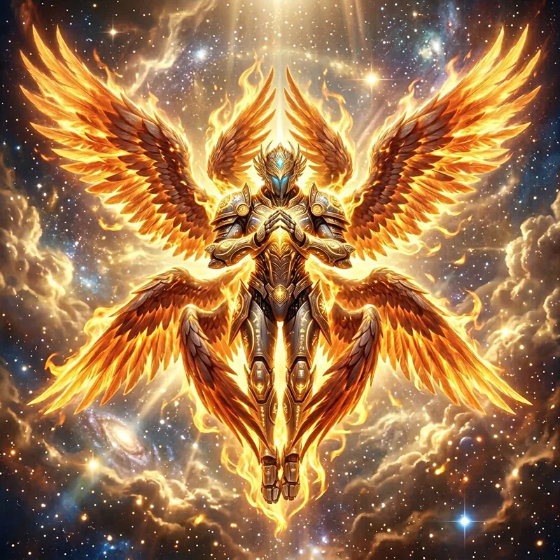 An ethereal and majestic scene depicting a Seraphim angel robot mecha hovering in the celestial realm, open eyes ,surrounded by radiant light and divine fire. The Seraphim has six magnificent, feathered wings: two covering its face, two covering its feet, and two spread wide for flying. Its form glows with a fiery brilliance, and its eyes shine with wisdom and holiness. Around the Seraphim, an aura of golden flames flickers, casting a warm, heavenly glow across a backdrop of swirling clouds and stars. The angel’s expression is serene and filled with awe as it chants praises to the divine, embodying a sense of purity, power, and celestial grace."