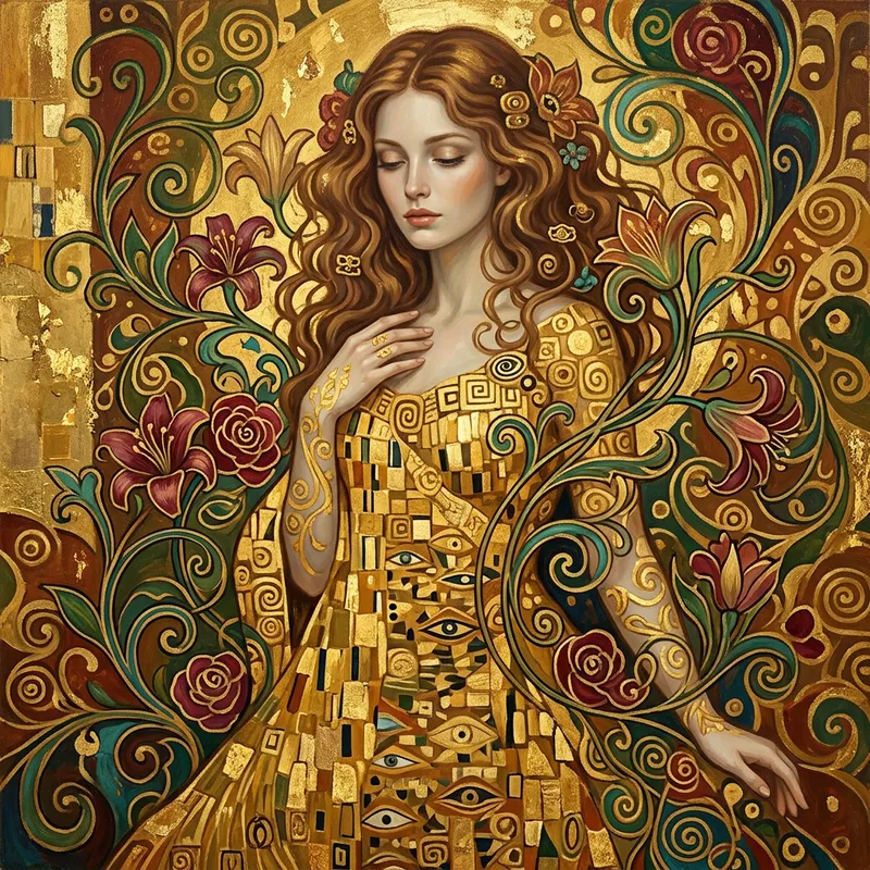 an ethereal model adorned in golden patterns, reminiscent of Gustav Klimt's work, surrounded by swirling floral motifs, serene facial expression, softly flowing hair, painted with vivid golds and rich earth tones, digital painting, art nouveau-inspired