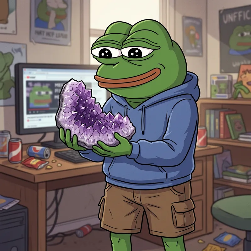 An illustration of a green frog cartoon character with wide, expressive eyes, and a smirk. The character is anthropomorphic, standing upright and often seen in various humorous or meme-related contexts. He is holding a beautiful amethyst in his hands.