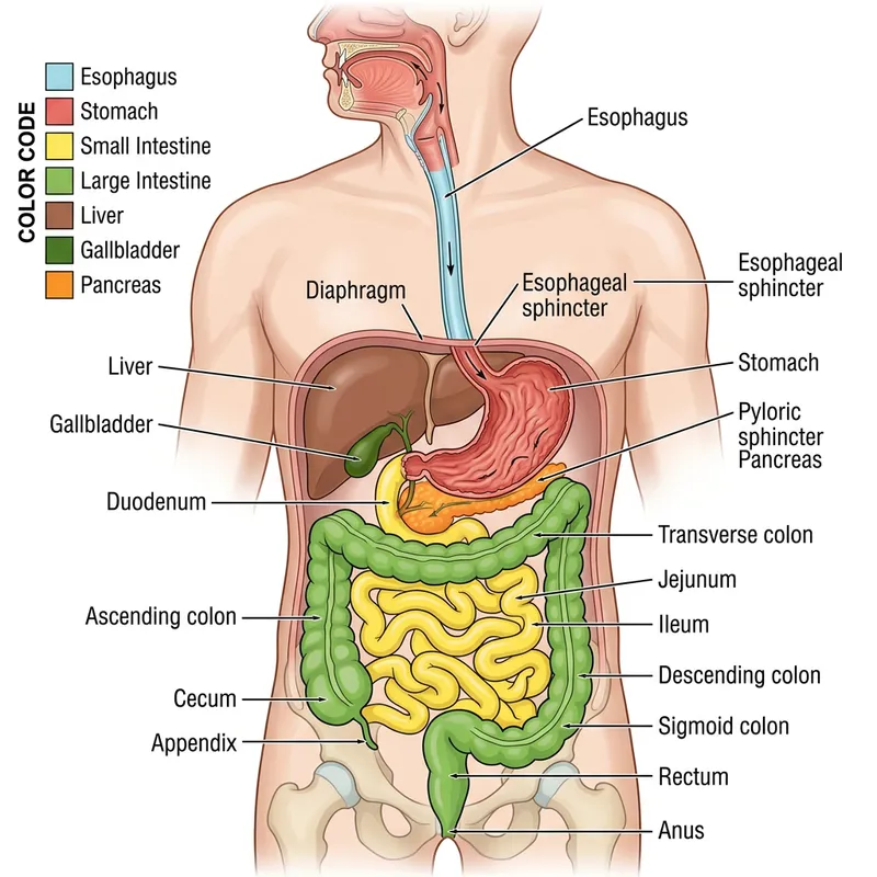 An illustration of the human digestive system. The image shows a detailed interior view of the human body from neck to pelvis. The esophagus, stomach, small intestine, large intestine, and other organs related to digestion are visualized. They should be color-coded for easy differentiation. The esophagus is a long, thin tube, the stomach is a large, bag-like organ, the small intestine is a long, winding tube, and the large intestine wraps around the edge of the abdominal cavity.