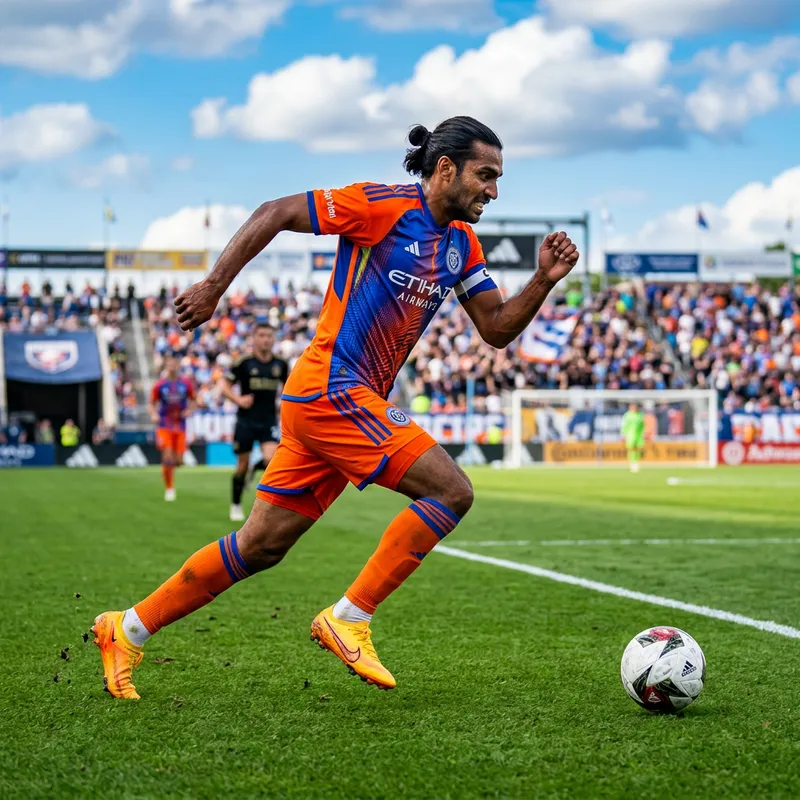 An image of a professional football player in motion, wearing a brightly colored jersey with matching shorts and cleats. They are of South Asian descent and have a determined expression on their face as they chase after the football on a lush green football pitch. The sky is blue with fluffy white clouds, creating a perfect day for a football game.