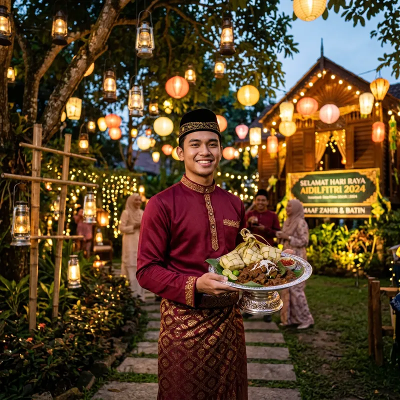 An image of a person celebrating Aidilfitri in 2024. The person is standing outdoors, surrounded by beautifully lit lanterns that hang from the trees in the evening's soft glow. They're donning traditional Malay attire, featuring a Baju Melayu and a Songkok, in deep tones of maroon and gold. The person holds a silver plate filled with Ketupat and Rendang, delicacies associated with the Aidilfitri festivities. There's a sense of joy and warmth in his eyes, reflecting the essence of the Eid celebration in the year 2024.