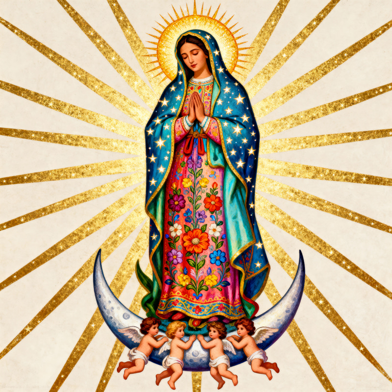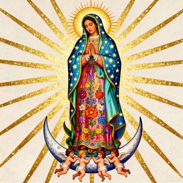 An image of a revered female religious figure, reminiscent of iconography from Mexico. She wears a cloak covered in dazzling stars and has a radiant halo around her head. Her face is calm and peaceful as she keeps her hands clasped in prayer. Four cherubs support her from below as she stands on a crescent moon. A medley of golden rays emanate from her in the background, symbolizing spiritual illumination. Her robe is colorful and ornately decorated with floral patterns, emphasizing her striking presence.