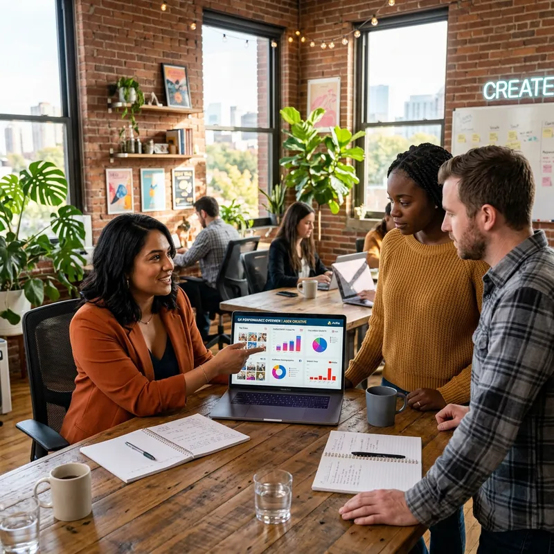 An image of a professional social media manager with caramel skin and black hair, working in a vibrant, open-concept coworking space with large windows, exposed brick walls, and creative décor. She is seated at a shared wooden table, showing detailed social media analytics on her laptop screen to two colleagues—one Black and one white—who stand beside her, attentively watching. The laptop screen displays charts and insights from platforms like Facebook, Instagram, and YouTube. The atmosphere is collaborative and dynamic, with indoor plants, sunlight streaming in, and a creative, modern vibe. She gestures confidently as she leads the discussion.