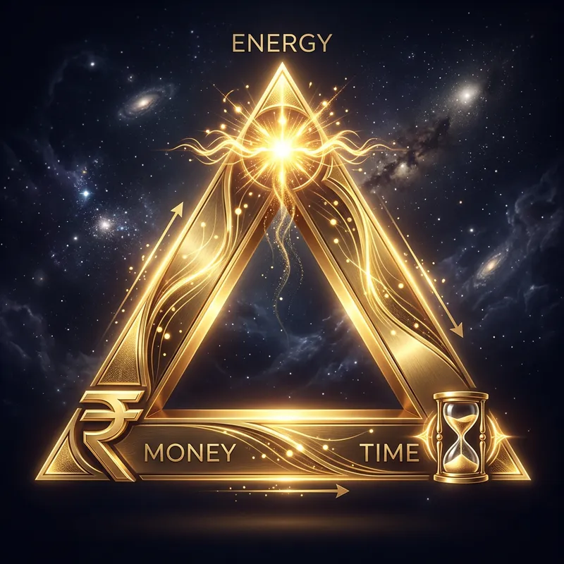 An impressive 3D rendering of a golden triangle symbolizing the interaction of energy, money, and time. The triangle's peak is adorned with a symbol of radiant energy, while the left corner features a stylized indian rupee sign to represent money, and the right corner displays a sand hourglass symbol for time. The triangle is set against a dark, almost celestial background, creating a dramatic visual contrast. Overall, the design boasts a fashionable and modern aesthetic, making it suitable for a poster or other mass communication visual mediums.