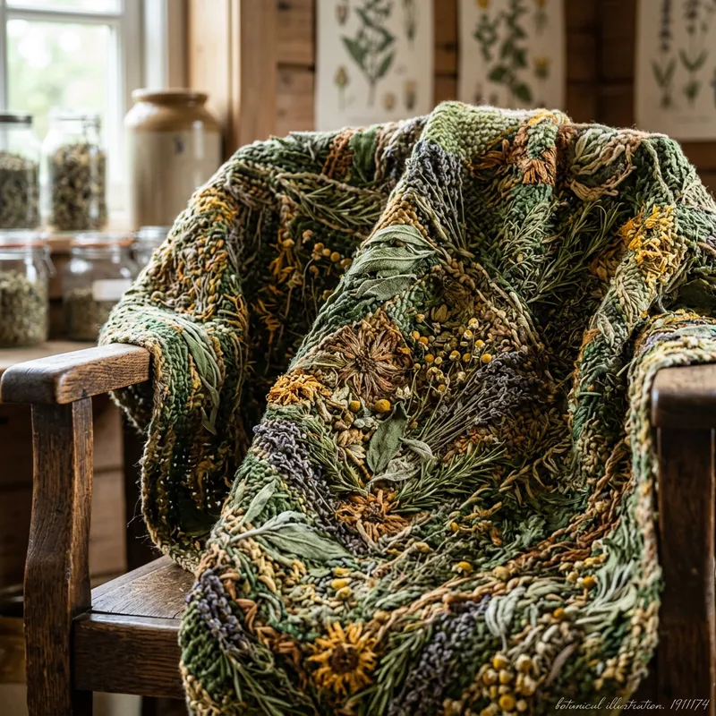 an intricate blanket woven from various medicinal herbs and leaves, styled in a nature-inspired color palette of greens and earthy tones, softly draped over a wooden chair, gentle textures and patterns, captured with a macro lens to emphasize details, botanical illustration.