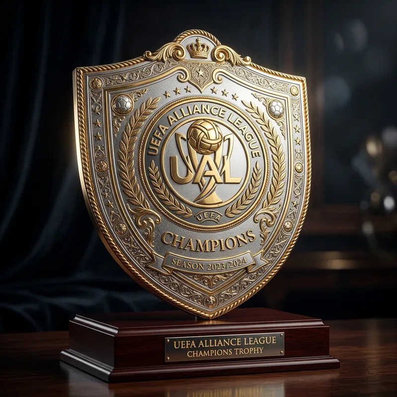 an intricate football trophy shield featuring the UEFA Alliance League emblem, styled in a combination of gold and silver tones with a polished finish, showcasing detailed engravings and ornate patterns, captured in a high-resolution studio photo, emphasizing reflections and textures, professional product photography, dramatic lighting.