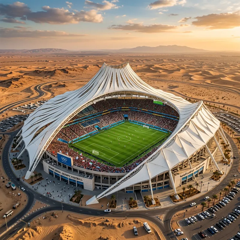 an olympic football staduim in the desert covered with white strips in a shape of a big arabic tent ,hyper realistic