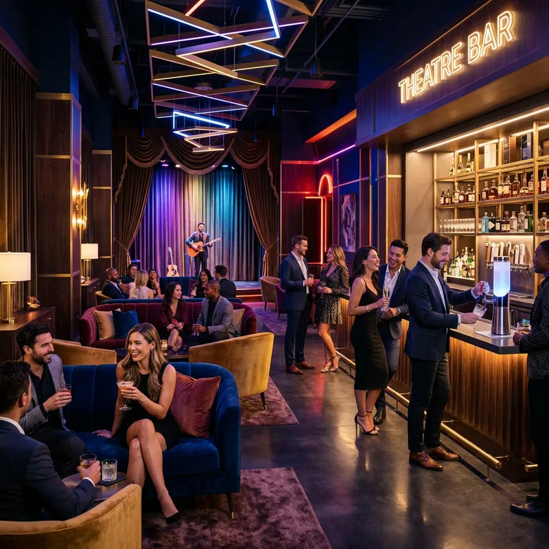 An upscale VIP lounge with a self-service bar, modern design elements blended with theater influences, illuminated with dramatic lighting, vibrant colors, and plush seating, showcasing patrons enjoying the space. Can you make it more modern?