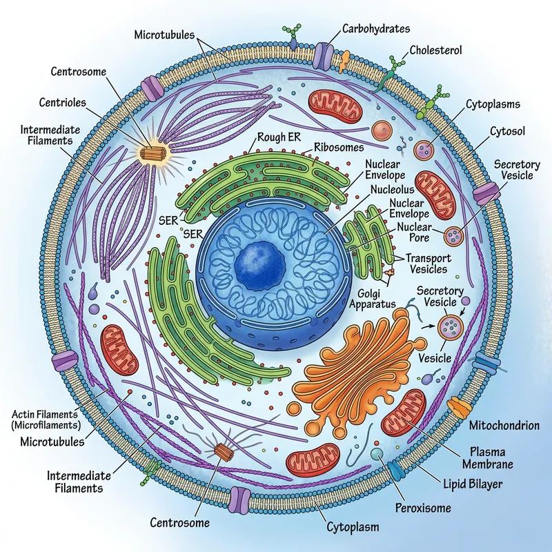 Visualize a detailed scientific illustration of a eukaryotic cell structure. The large, central nucleus should be visible, enclosed by a nuclear envelope with nuclear pores. Surrounding the nucleus, cytoplasm contains organelles like mitochondria, ribosomes, and the endoplasmic reticulum. A well-organized Golgi apparatus should be seen, with vesicles transporting materials within the cell. The cell membrane should be clearly defined and details like lipid bilayer and proteins should be visible. Intricate microtubules and intermediate filaments making up the cytoskeleton are also needed for the complete picture.