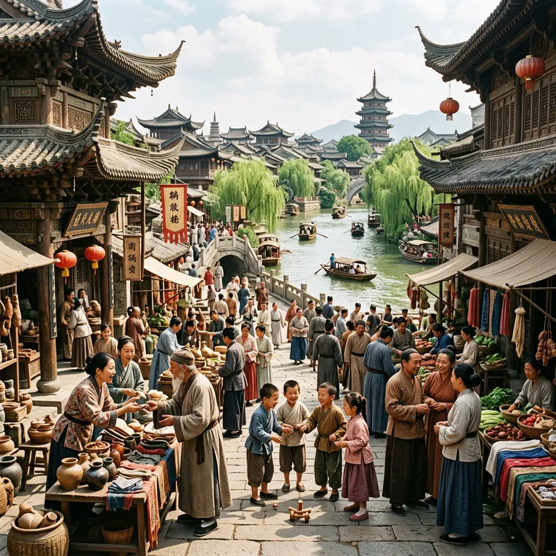 A photo of an ancient Chinese civilization. The scene is filled with traditional Chinese architecture, including structures with curved roofs and intricate carvings. Streets are bustling with diverse citizens, both male and female, from different age groups and physical appearances, engrossed in various activities like bartering at the market, chatting, and children playing traditional games. The landscape also features a gently flowing river with wooden boats, surrounded by lush greenery.