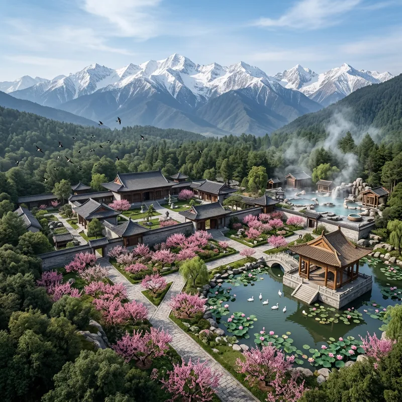 A stunning image of an ancient Chinese estate set from a distant perspective. The picturesque scenery is backed by towering, snow-capped mountains, and is enclosed by an enchanting forest where flocks of swallows fly freely. Neatly arranged stone pathways meander over the estate, lined by magnificent gardens bursting with the pink hue of plum blossoms. Tucked away on the east side, a quaint pavilion sits elegantly above a serene pond embellished with blooming lotuses and swans gracefully swimming. Towards the northeast corner of the estate, a sprawling hot spring provides a calming retreat, emanating a tranquil ambiance into the surroundings.